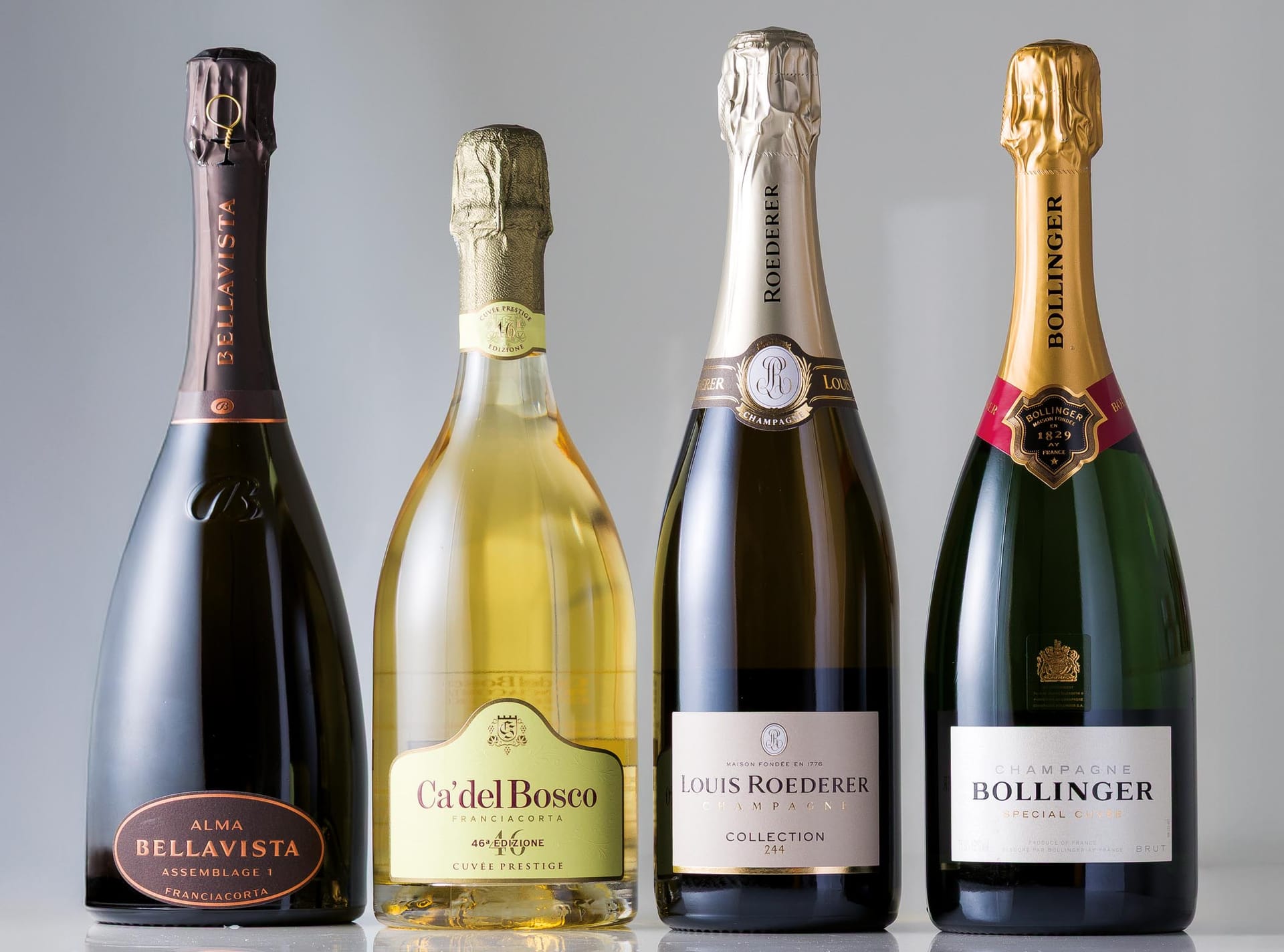 Selezione di 4 bottiglie di spumanti e Champagne di altissima gamma, tra cui Franciacorta Bellavista Alma Assemblage e Cuvée Prestige, e Champagne Louis Roederer e Special Cuvée Bollinger.