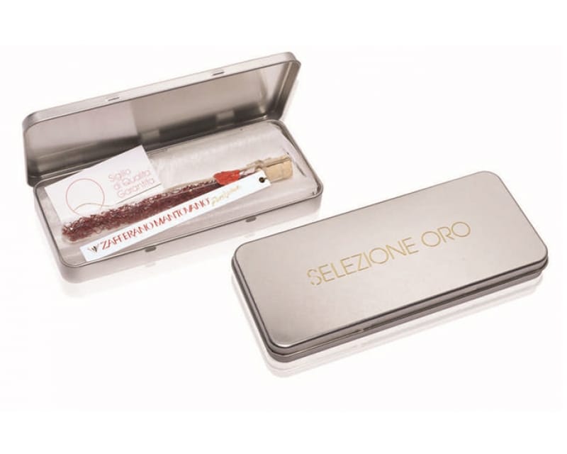 Provetta con 1 g. di zafferano e 320 gr. di riso Vialone Nano in scatola di alluminio satinato, logo in ceralacca e tappo in sughero, cordoncini e cartoncini descrittivi con stampa in oro a caldo, dimensioni 22x17x7 cm. (Riso in sacchetto di iuta)