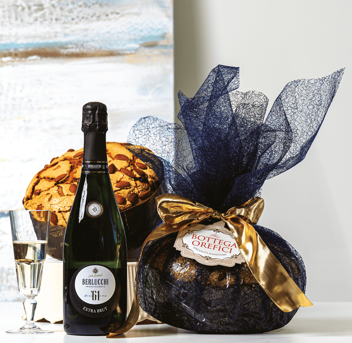 Confezione di pregio da due pezzi che abbina l'eccellenza del Franciacorta DOCG extra brut Storica ‘61 Berlucchi con il Panettone basso glassato alle mandorle incartato a mano Bottega Orefici.