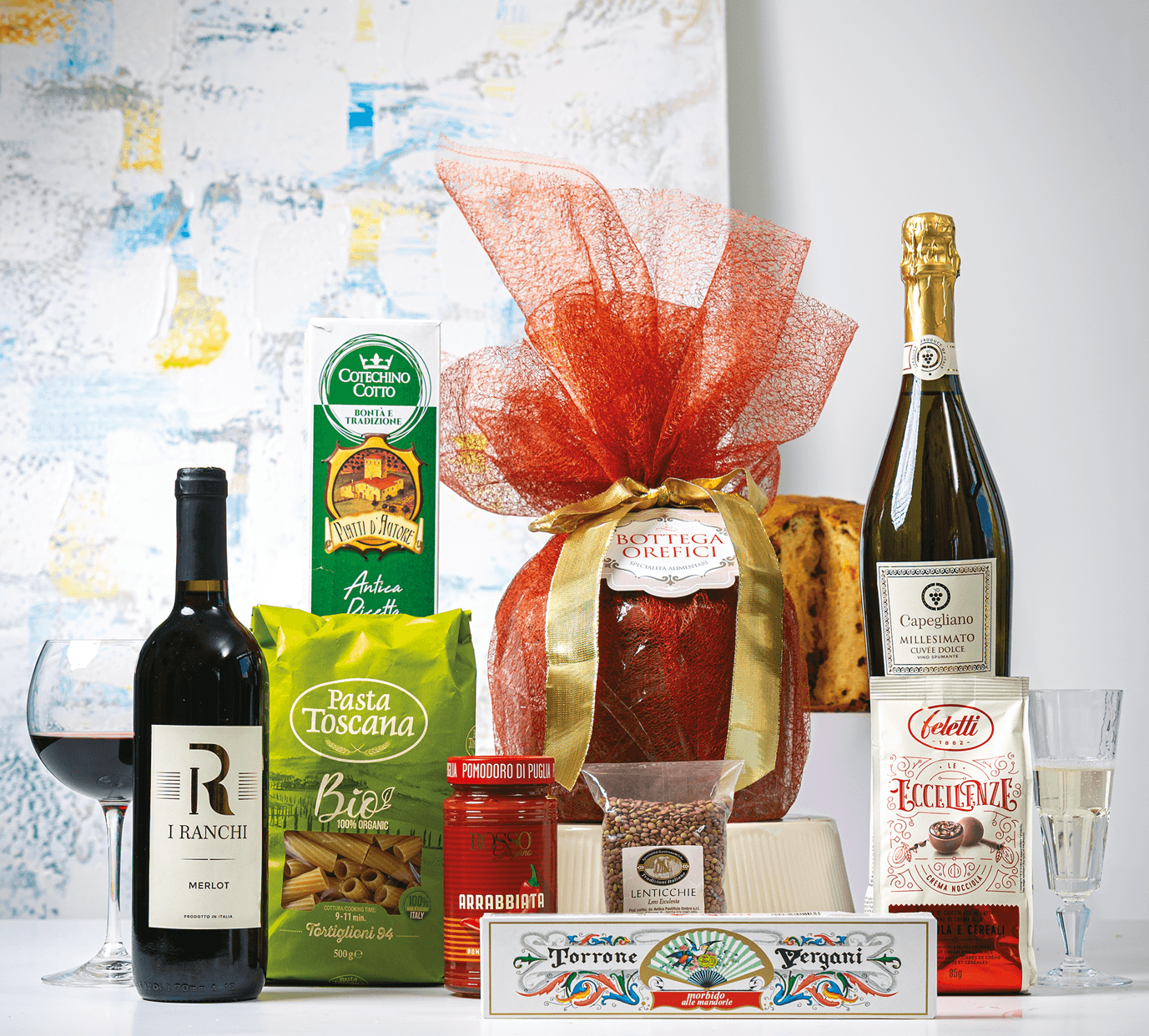 Ricca confezione da 9 pezzi che copre sia la pasticceria natalizia (Panettone) che i prodotti gastronomici per il pranzo. Include pasta biologica, sugo all’arrabbiata, cotechino, lenticchie e vino rosso Merlot.