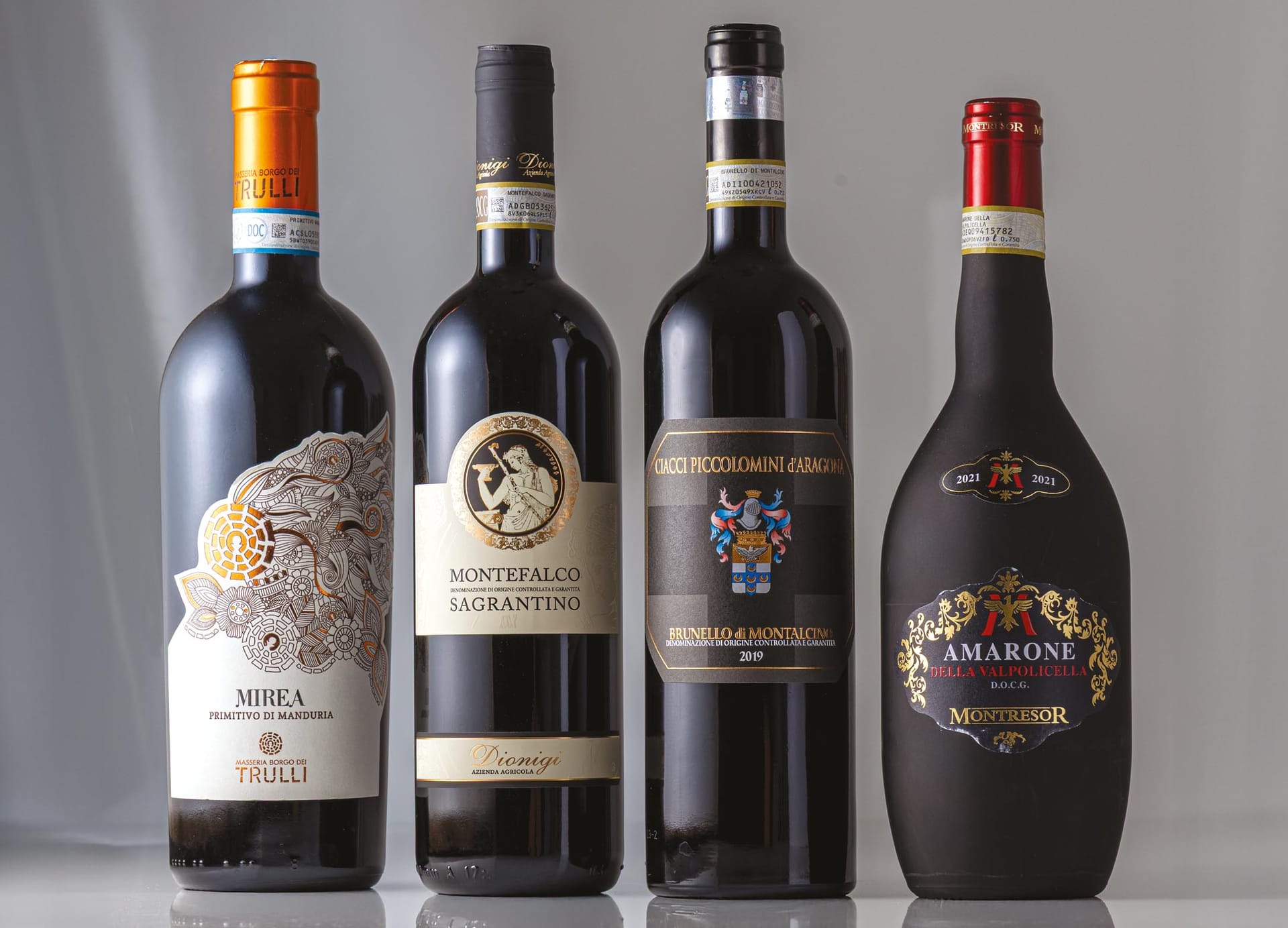 Quartetto di grandi rossi, con vini potenti e strutturati: Primitivo di Manduria DOC, Montefalco Sagrantino, Brunello di Montalcino DOCG e Amarone della Valpolicella.