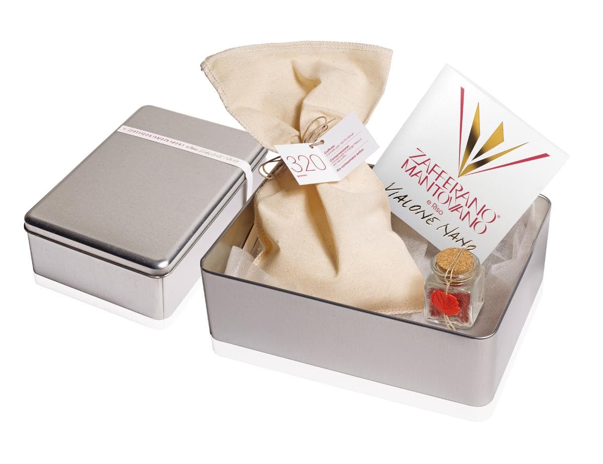 Vasetto con 0,30 g. di zafferano e 320 gr. di riso Vialone Nanoin scatola di alluminio satinato, logo in ceralacca e tappo in sughero,cordoncini e cartoncini descrittivi con stampa in oro a caldo,dimensioni 22x17x7 cm.